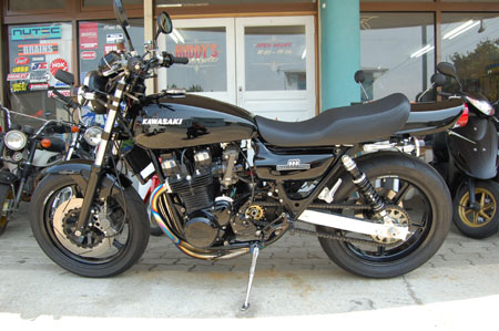 | KAWASAKI 1974年 Z1A(900Super Four) フルカスタム&フルチューン 応談 ■年 式:1974年 ■走 行 距 離 :チューン後792マイル(1,267キロ) ■検 査:平成27年3月27日 ■車 台 番 号 :Z1F-31611 ■エンジン番号:Z1E23526 ■型 式:Z1F ■原動機型式 :Z1E ■排 気 量 :1,105cc スペック ■シャーシ&ボディー フレーム 14ヶ所フレーム補強、レイダウン、ウレタンブラック塗装 エンジンハンガー KEINZ BILLET HANGER ブラックアルマイト サイドスタンド ステンレス製アジャスタブルサイドスタンド、ステンレス製スプリング&ボルト ステアリングステム BILLETトリプル ハンドル POSH NARROW UP BAR BLACK スロットル ACTIVE TYPE-2 ハイスロットル フロントフォーク KYBΦ38㎜ フロントホイル MAGTAN JB1 3.00J-18 マグネシュウム フロントブレーキ キャリパー:APレーシングCP2696 ダブル マスター :APレーシングCP4125-26 プル式ラジアルポンプ ミラーホルダー ローター :SUNSTAR TRAD TypeⅡ フロントフェンダー FRPショート リヤフェンダー フェンダーレスキット スイングアーム モリワキ アルミ、KEINZトルクロッドマウント リヤブレーキ キャリパー:APレーシングCP2696 マスター :ブレンボ ローター :SUNSTAR TRAD TypeⅡ KEINZ ブラックアルマイト キャリパーサポート リアショック QUANTUM KZ-Twin リアホイール MAGTAN JB1 4.00J-18 マグネシュウム タイヤ DUNLOP SPORTMAX α-12Z フロント:110/80-18 リア:150/70-18 ドライブチェーン EK530ZVX メインステップ BabyFace バックステップ ブラック タンデムステップ モリワキ タンデムステップ シート FRPシートベース&あんこ抜きカスタムシート シートベース制作:エアーペイントタカノ あんこ抜きシート制作:スタイルシートカスタム 油圧クラッチ リレーズプレート:KEINZ ブラックアルマイト マスター :APレーシングCP4125-26 プル式ラジアルポンプ ミラーホルダー ペイント ブラックウレタン塗装 電装 ASウオタニSP2フルパワーキット STACK ST-200 電気式タコメーター ヨシムラ デジタル油温計 Brightecハロゲンヘッドライト その他 アルミツールケースキット ステンレス製シートロック(キャッチレバー、キャッチ、ラッチ) ステンレス製バッテリーケース ステンレス製電装プレート、ステンレス製センターハーネスブラケット ピンゲル ガソリンコック、ピンゲル インラインフィルター ■吸排気系 エキゾーストマフラー モリワキ チタン製MONSTER RACING キャブレター ケイヒン JB FCR39Φブラックアルマイト KEINZアルミ削り出しファンネル ブラックアルマイト ■エンジン ピストン ヨシムラΦ73㎜ クランク STD芯出し シリンダー オーバーサイズライナー クラッチ STD ミッション STD シリンダースタッド GPz1100F STD シリンダーヘッド GPz1100F STDバルブ IN:Φ38.0㎜ EX:Φ32.0㎜ APEカムチェーンアダプター 強化カムチェーン バルブガイド GPz1100F STD バルブリテーナー ヨシムラ コッター ヨシムラ バルブスプリング ヨシムラ カムシャフト ヨシムラ中空ST-2 カムテンショナー BILLETオートカムテンショナー オイルクーラー EARL’S 9インチ13段ラウンドコア&ブラックホース サイド回し その他 クランクミーリング加工 INポート研磨、EXポート鏡面研磨 モリワキ キックシャフトオフカバー、モリワキ ポイントカバー エンジン ブラック塗装 |